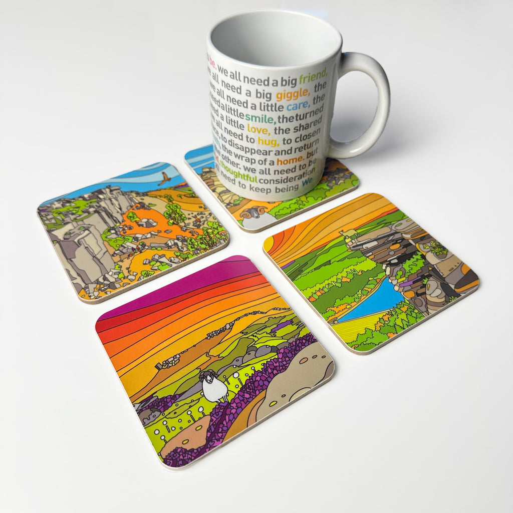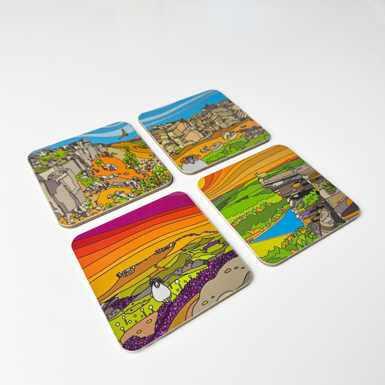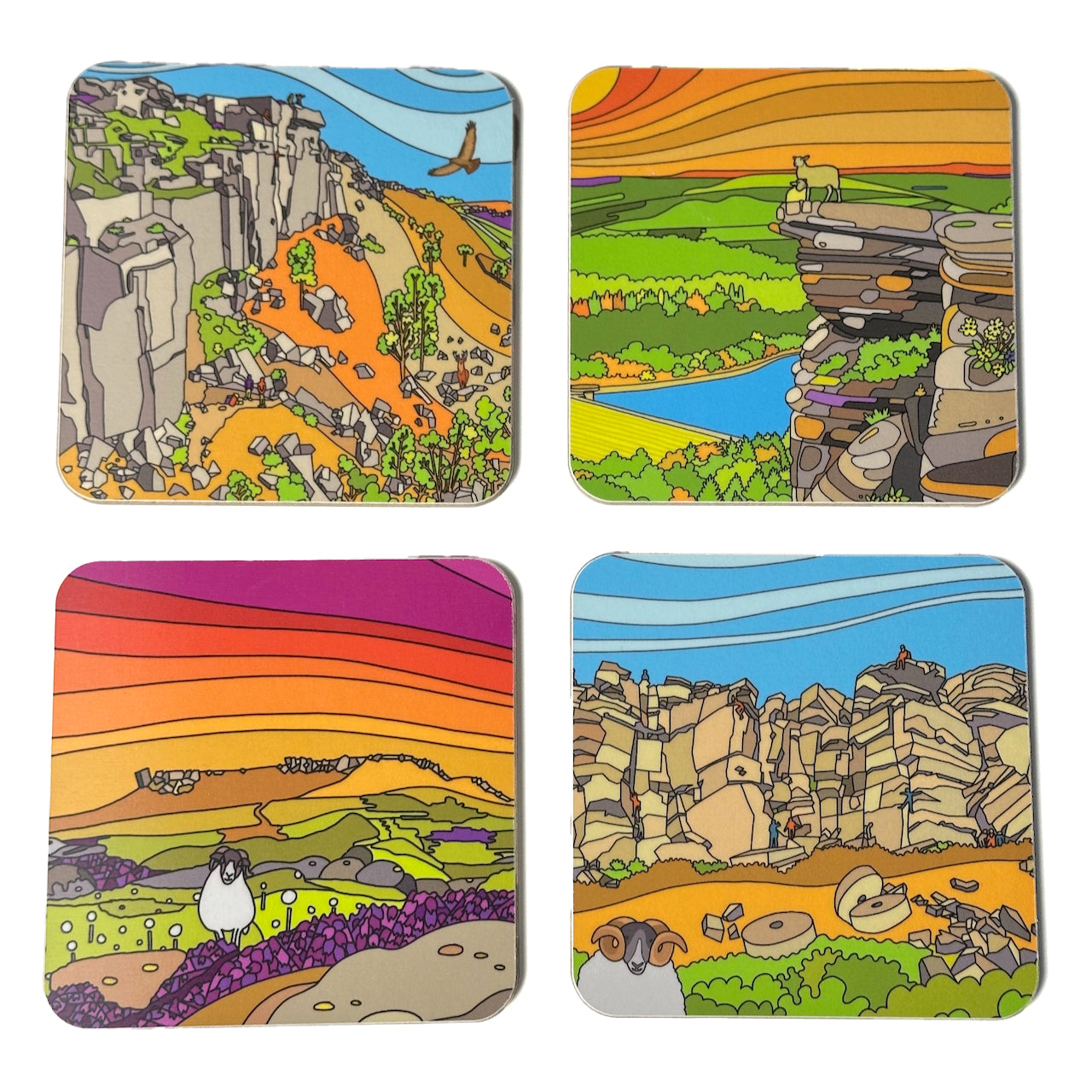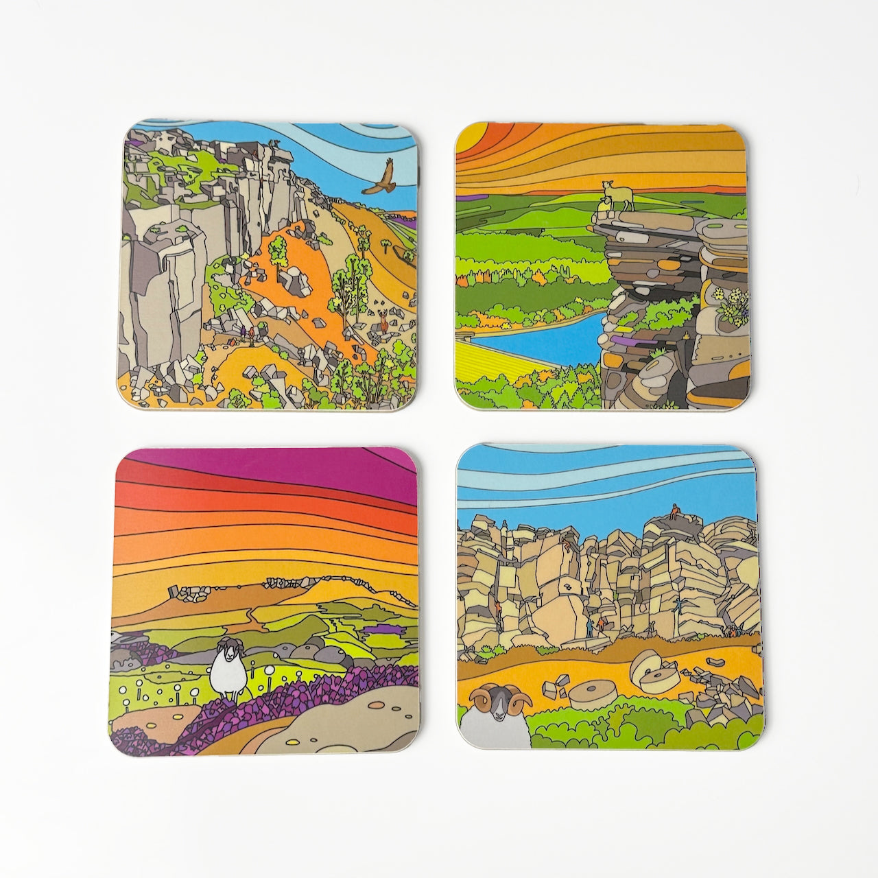 High quality, durable, coaster set. A design featuring 4 Peak District round coasters reflecting the contemporary work of Peak District artist Si Homfray.