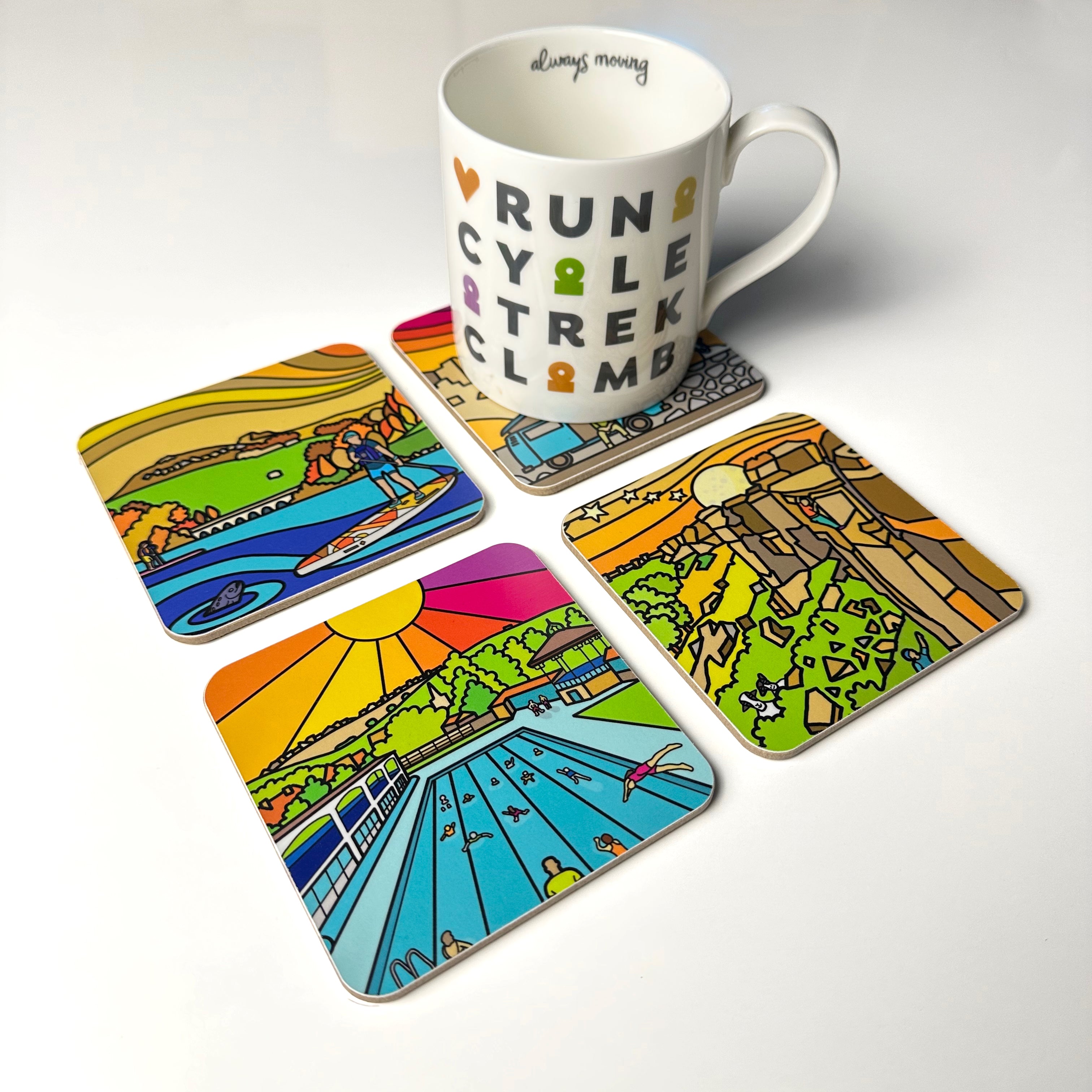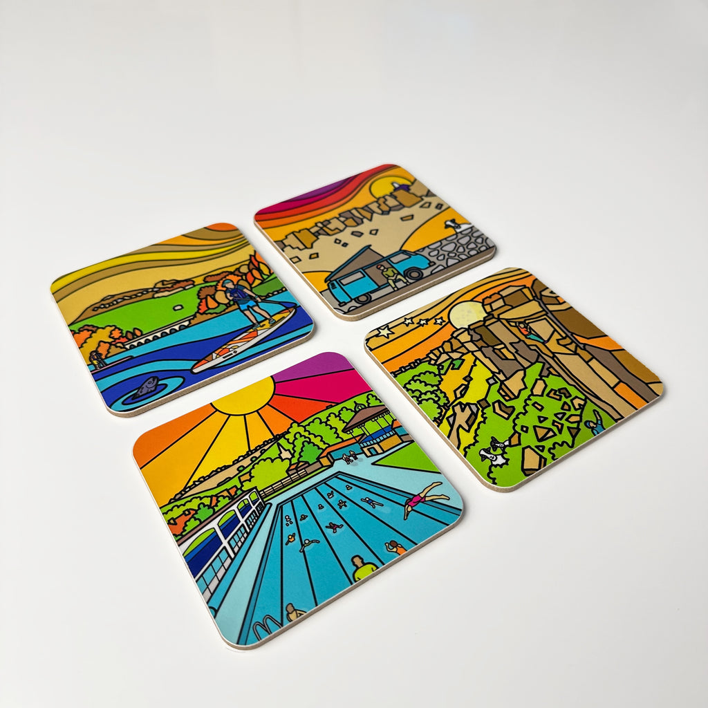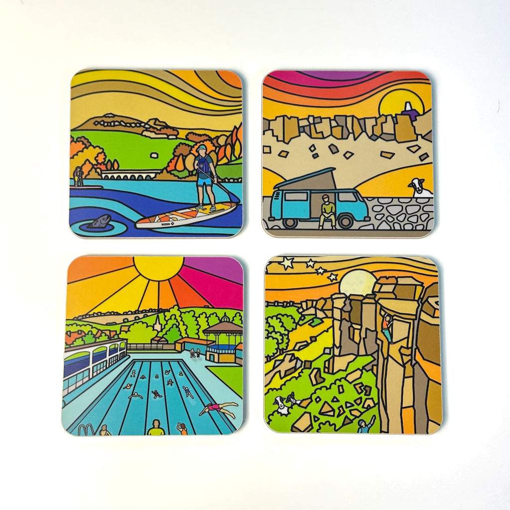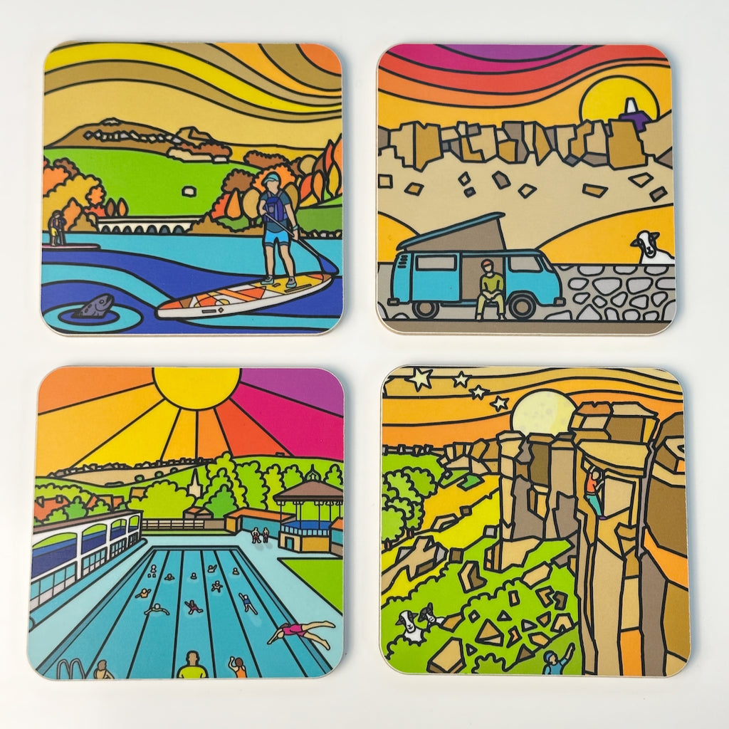 High quality, durable, coaster set. A design featuring 4 Peak District square coasters reflecting the contemporary work of Peak District artist Si Homfray.