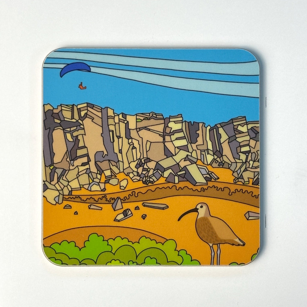The Stanage Trip Tick 03 is one of a three part set, depicting some of the most famous aspects of the area. A curlew and a paraglider . The others in the series include rock climbers, runners, mountain bikers and walkers.