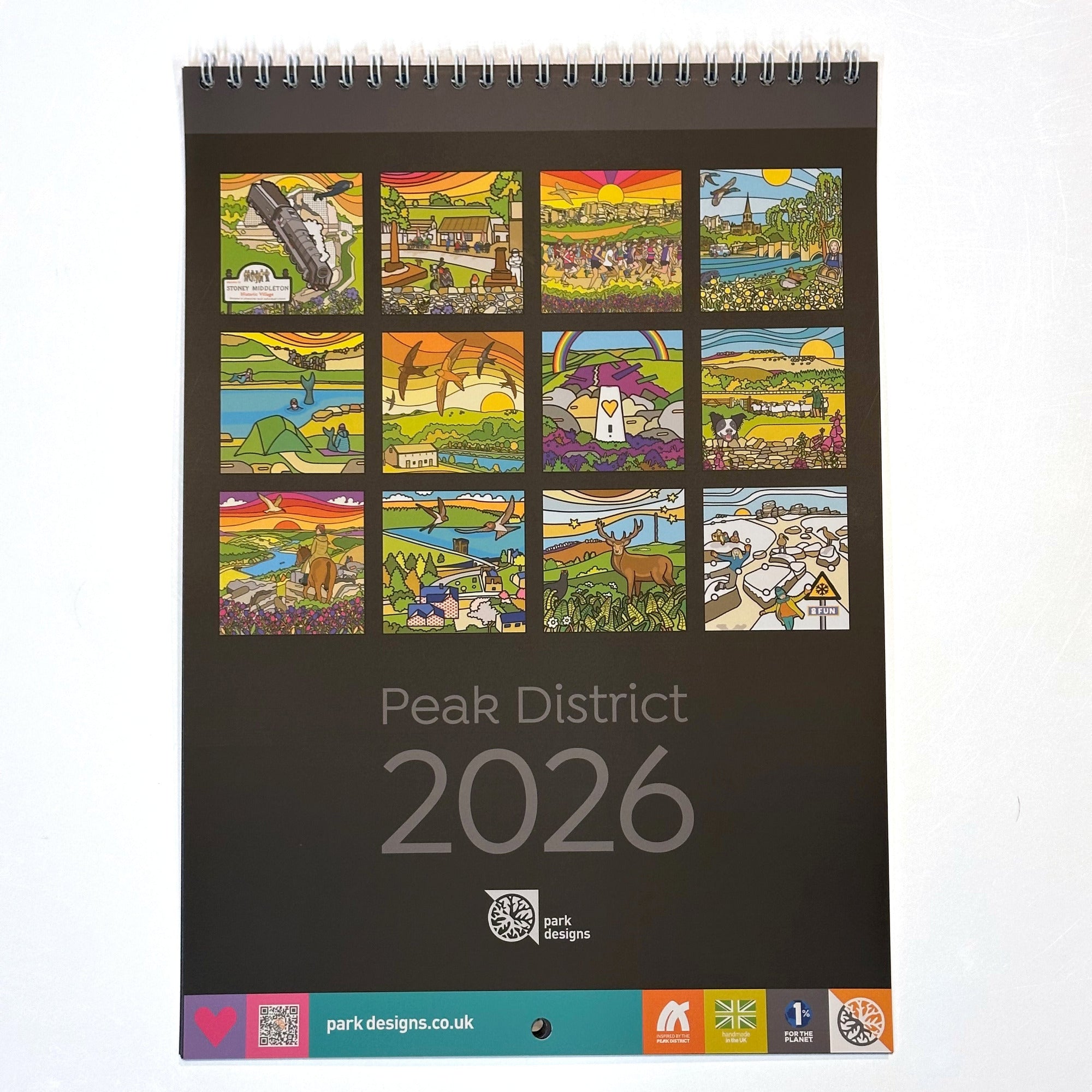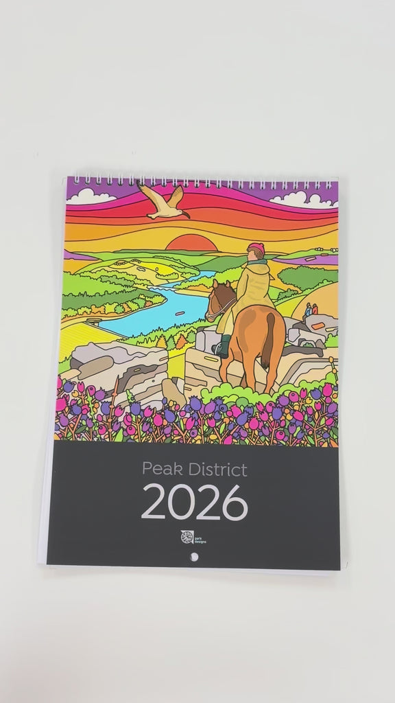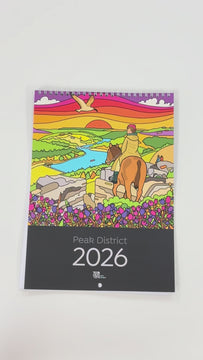 A luxurious feel practical wall calendar with ample space for writing on throughout the year. Featuring 12 brand new for 2026 colourful mini drawings from around the Peak District by Si.